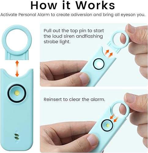 Easy to Use: The personal safety alarm siren does not require training or skill to operate, use it in case of emergency or need help, pull up the self-defense keychain alarm, and the personal alarm will sound, inserting it to stop. Protect yourself in a moment of need with a defense siren.