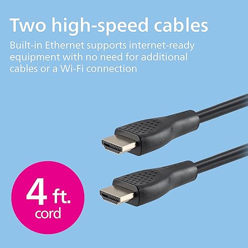 Two high speed HDMI cables – Built-in Ethernet supports internet-ready equipment with no need for additional cables or a Wi-Fi connection; 4 ft. length is perfect for compact setups; pack of two HDMI cables