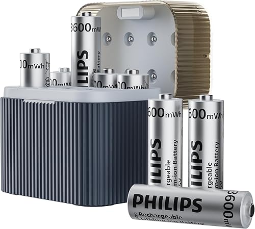 PHILIPS Rechargeable Lithium AA Batteries with Fast Charger 8 Pack 1.5V 3600mWh High Capacity AA Battery Constant Output Li-ion Double a Batteries Cycle Times up to 1200x