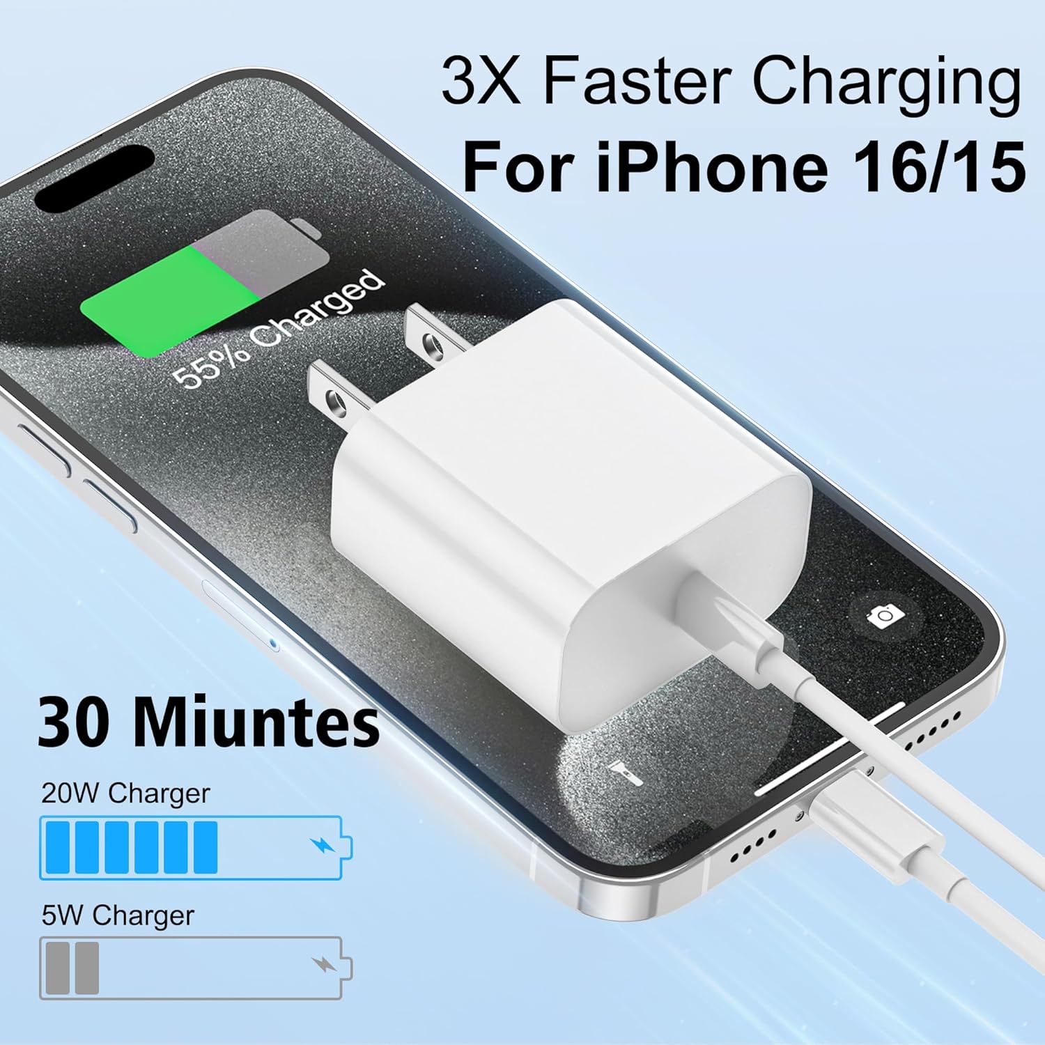 【Phone 16 Charger】20W PD USB Type C power delivery wall plug, PD adapter 3.0 Quickly Charge , USB-C port provides Max 20W output power, 3X faster than standard USB charger. charging your up to 50% in just 30 minutes for iPad Pro Charging, At 3A Maximum, Helps You Work Efficiently.