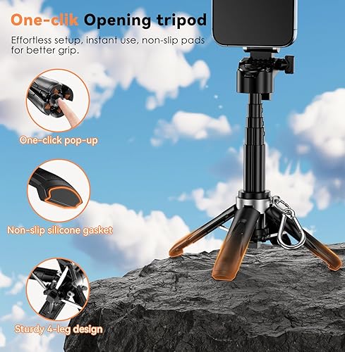 [Sturdy, Stable, and Durable] This retractable mini selfie stick travel tripod is made of high-quality aluminum alloy. It's not only lightweight, but also contains a silicone gasket on the bottom of the bracket to ensure stability and durability. The one-button pop-up quadripod allows you to quickly and easily start your photography journey.