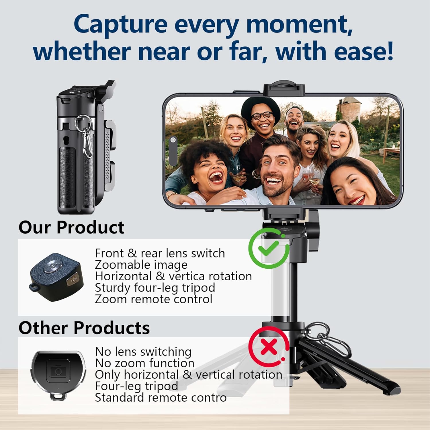 With Zoom Function: Comes with a detachable remote that not only lets you snap photos and start/stop video recording from a distance, but also supports zoom in/out for easy framing without touching your phone.