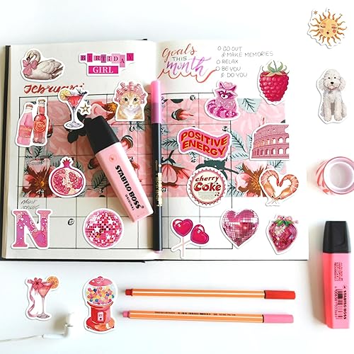 PACKAGE CONTENTS: Set of 55 high-quality pink aesthetic stickers featuring cute designs including hearts, animals, drinks, disco balls, and decorative elements
