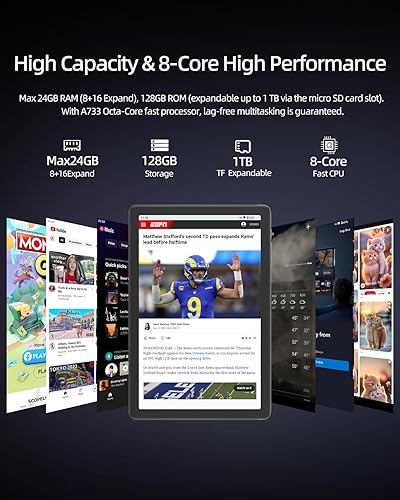 24GB+128GB Storage: The 10 inch tablet is equipped features smart RAM allocation, enabling you to expand 8GB RAM to 16GB. Processing speed will be increased by 20%. With 128GB of internal storage, freely download Netflix/YouTube/Instagram/TikTok/Twitter. It also supports storage expansion of up to 1TB via an external memory card. No more anxiety about running out of memory on your tablet.