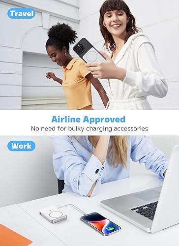 【10,000mAh High-Capacity & Dual Fast Charging】:Never run out of power with this portable charger power bank. The 10000mAh battery delivers up to 2 full charges for iPhone 15 Pro Max or 30+ hours of extra battery life, giving you reliable power throughout travel, long workdays, or unexpected emergencies. Simultaneously charge your iPhone via for MagSafe wireless charging at 15W and another device like AirPods or an Apple Watch using the 20W Type-C wired output. Recharge the power bank quickly with 18W input via Type-C. Perfect for multitaskers who need all devices ready at once.