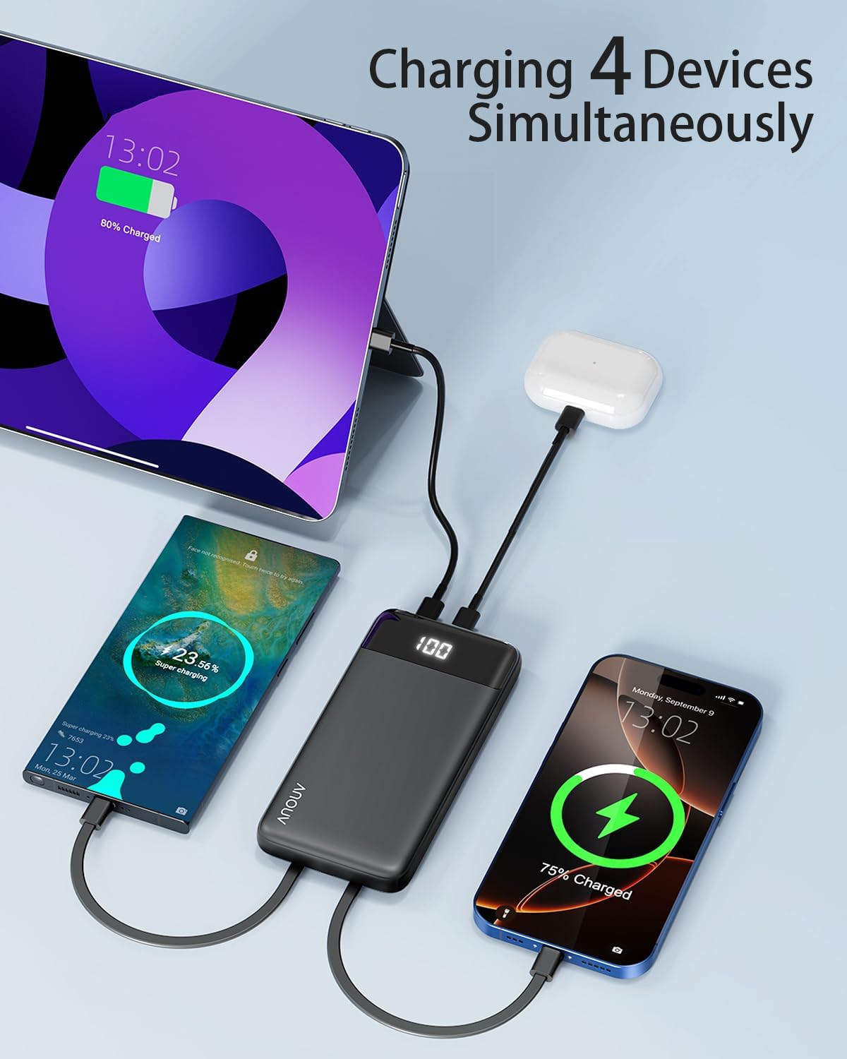Universal Compatibility: As fast charging power bank built with all cables and ports, it is compatible with multiple devices such as iPhone 17 16 15 14 13 12 11 series, Samsung Galaxy S25 S24 S23, Google Pixel 9 8 7, USB fans and more
