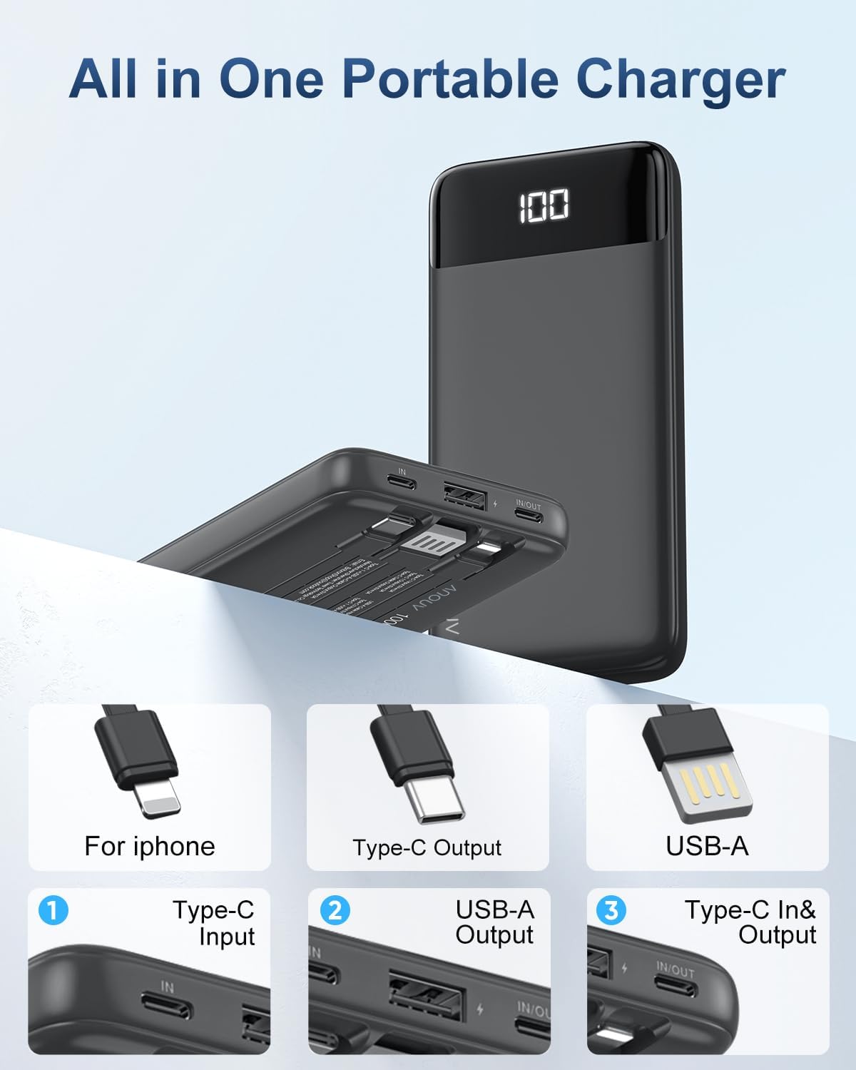 Say Goodbye to Cable Clutter! Built-in Cables: This slim portable charger features 3 built-in cables (Type-C cable/ iPhone cable for output, USB-A cable for input), making it compatible with virtually all phones and tablets—including iPhone, Samsung, Google Pixel, iPads, and beyond. Your all-in-one power solution has arrived