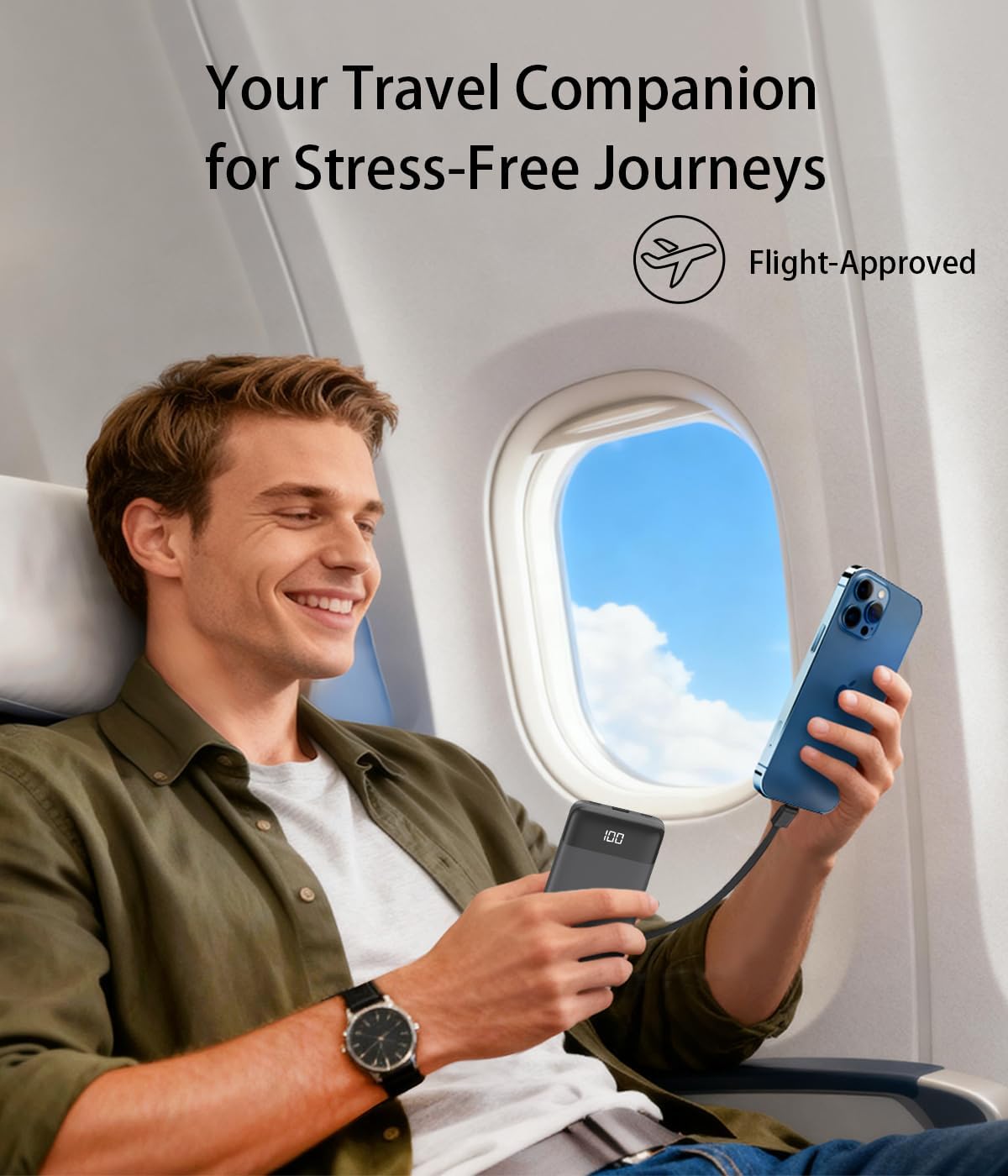 Airline Approved & Ultimate Travel Companion: Take it anywhere! This 10,000mAh power bank meets all major airline regulations. Its incredibly slim design and built-in cables let it slip effortlessly into your pocket or bag. Perfect for hassle-free power on flights, road trips, or your daily commute. Your essential on-the-go charging solution