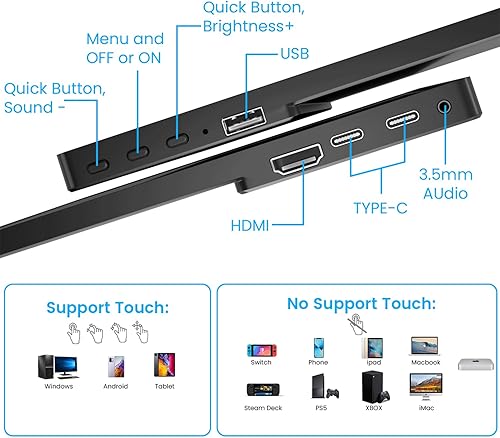Highly Responsive 10-Point Touchscreen with Built-in Speakers This 10-point touchscreen portable monitor provides accurate, lag-free interaction for drawing, swiping, zooming, and typing. Whether you're an artist, presenter, or power user, the screen responds seamlessly without a mouse or keyboard. The built-in stereo speakers offer clean, room-filling sound for meetings, gaming, or streaming without the need for external audio gear. NOTE: The touch function can not work on PS3/4/5, Xbox, Switch, Steam Deck, Fire TV Stick/Cube, iPhone, and iPad. This is a limitation of those systems, not a defect of the monitor.
