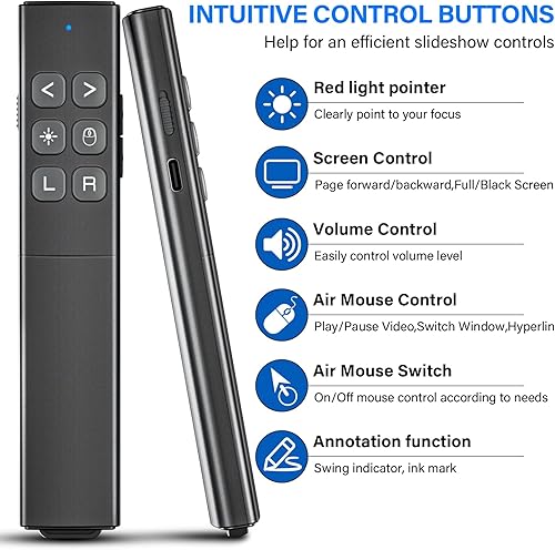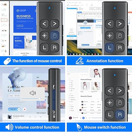 【Characteristic Functions - Air Mouse, Ink Annotation, Volume Control】This presentation remote is designed with air mouse, ink annotation, volume control functions into a regular presenter, which help you get a simple mouse functions like left mouse key, right mouse key, open a video or enter a website, keep the demonstration smooth when moving along.