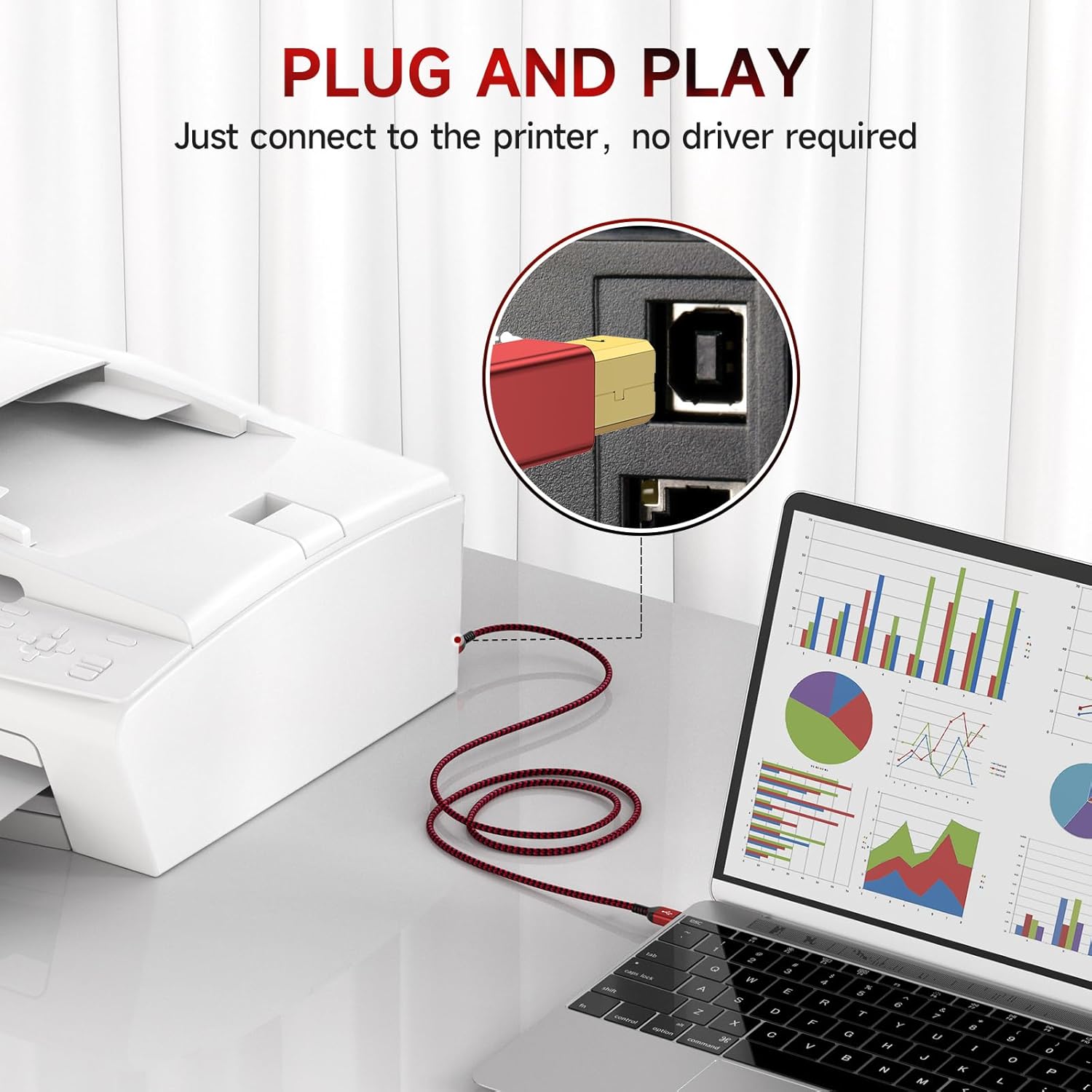 【HIGH-QULITY STRUCTURE】: In order to enhance the durability of the USB printer cord 6.6 ft, realize stable and clear printing. We chose high-purity copper wire, and increased the number of core wires and shielding layers to make long printer cable have a long service life and more stable connection.