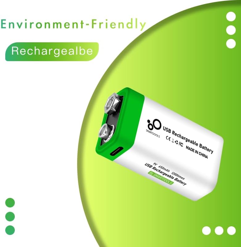Long-Lasting 650mAh 9 Volt LI-ion Batteries with Type C Charging Cable