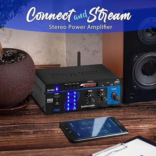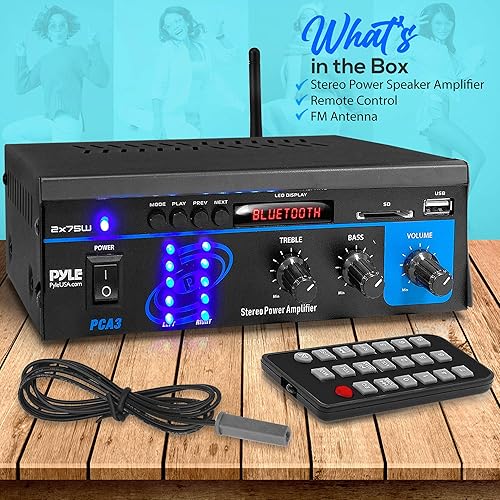 Pyle Powerful Mini Stereo Amplifier System – 2x75W Compact 2 Channel Audio Receiver w/LED Display, 40Ft. Wireless Bluetooth Streaming, RCA Inputs, EQ Controls for HT System and Studio, w/FM Antenna