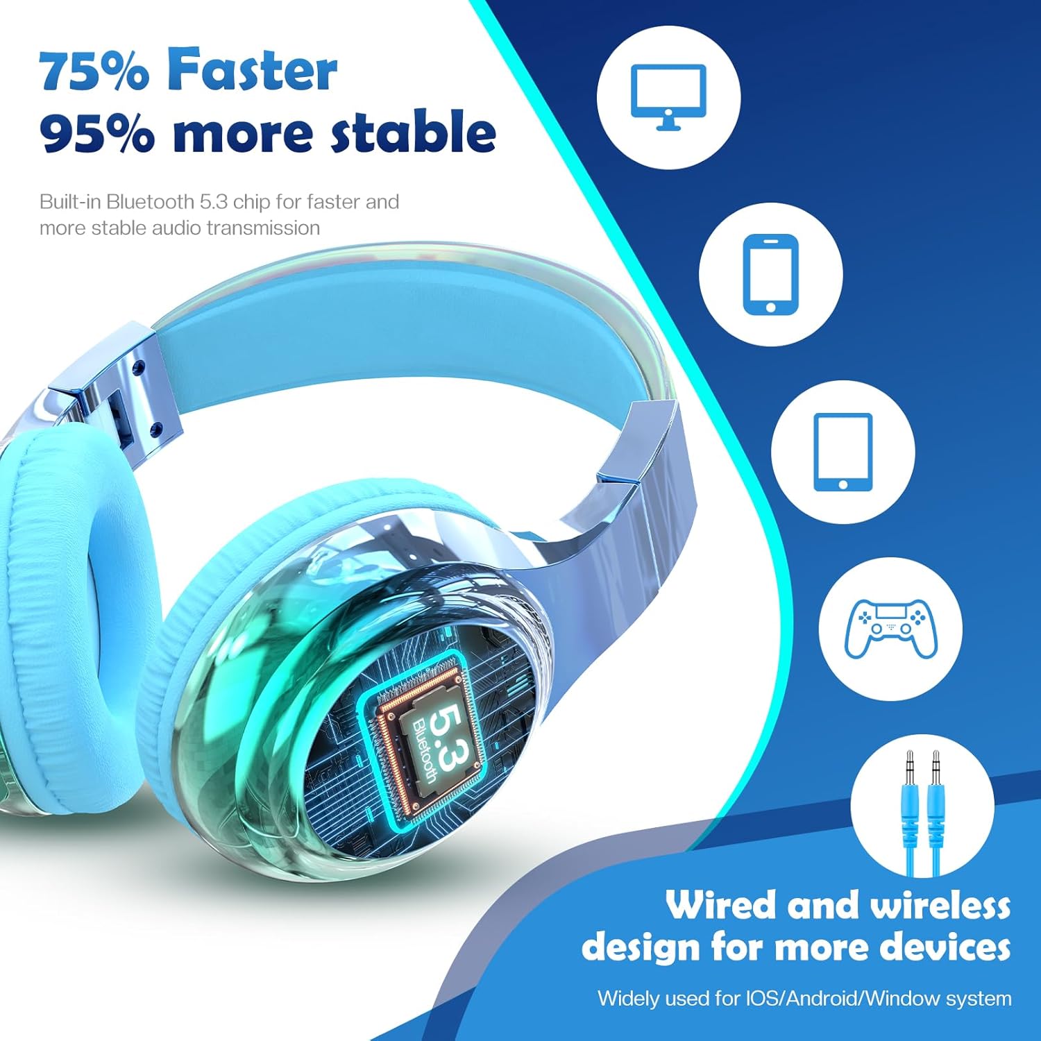 Bluetooth 5.3 + Wired Dual Mode for Stable & Smooth Listening:Equipped with the latest Bluetooth 5.3 chip, these headphones reduce signal interference by 65% and increase transmission speed by 75%, ensuring a stable connection and low latency—perfect for noisy environments like subways or airports. The included 80cm detachable 3.5mm audio cable supports both wired and wireless modes, making it versatile for school activities, library study sessions, or relaxing at the park.