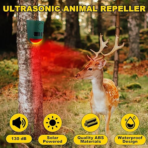 Pir Motion Detection: the solar motion sensor alarm is equipped with a PIR motion sensor that can detect motion at an angle of 110 degree and within a range of 30 feet; Automatically activate ultrasonic waves, flashing LED lights and alarm sounds to scare away unwanted animals such as cats, dogs, deer, raccoons, skunks and squirrels