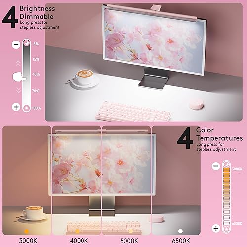 EYE CARE FIRST, BEAUTY ALWAYS - REVITALIZE YOUR WORKSPACE: Pink RGB monitor lamp blends functionality and elegance with flicker-free lighting and a chic pink design. The textured transparent shade reduces glare and simulates natural light colors, perfect for late-night tasks. Say goodbye to bulky desk lamps and embrace minimalism with this gaming computer light bar, enhancing both productivity and eye comfort while adding playful charm to your workspace.