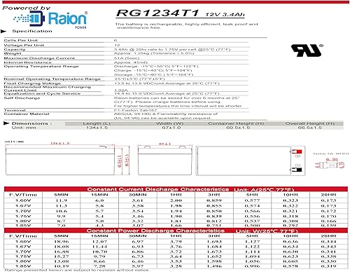 Raion Power 12V 3.4Ah rechargeable battery with T1 terminals is a compatible replacement for Duracell DURA12-3.3F2 battery