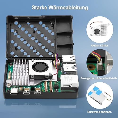 Pi5 Case with Active Cooler: Kit with the active cooler and case for Pi 5, provides optimal cooling for the Pi 5 development board. The case is designed for Raspberry Pi 5, precise access to the USB-C power jack, Micro HD output port, USB port, Ethernet jack, card slot, power button, 4-lane MIPI DSI/CSI connector, and supports installation of a cooling fan. The case compatible with Raspberry Pi 5 4GB/8GB/16GB/2GB.