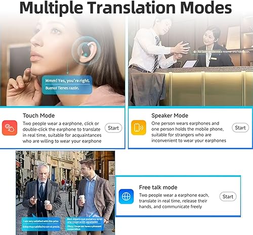 3 Powerful Translation Modes: Touch mode (real time translation with single or double click while each wearing one earphone, suitable for friends willing to wear your earphones); Speaker mode (one we