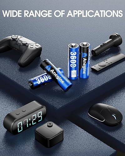 Rechargeable Lithium AA Batteries: Anegine rechargeable aa batteries lithium, with real capacity 3600mWh, constant output of 1.5V and support aa batteries recharge up to 2000+ cycles time, offering the long lasting effective power for your devices