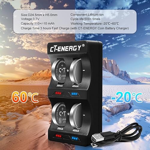 Quick Charging.Complete charge 4cs or 8pcs rechargeable 2450 batteries simultaneously in around 3 hours to complete the charging with CT-ENERGY coin battery charger.Reliable even in a range of working temperatures within -20°C to 60°C.