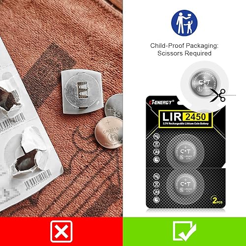 What’s Included?6pcs Rechargeable 2450 Lithium Batteries with Child-secure Packaging.The packaging is nearly impossible to open without scissors.Ensuring the safety of your children.