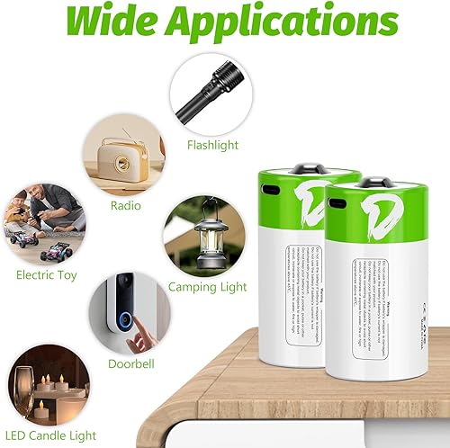 Convenient Charging: These batteries d size come with one USB-C charging cable, allowing you to conveniently fully charge them about 2 hrs using any USB power supply, such as computer, laptop, power bank, or wall adapter; No need extra battery charger (Support usb-c charging ONLY)
