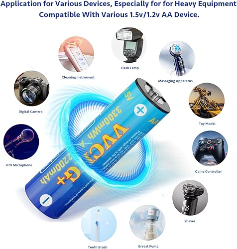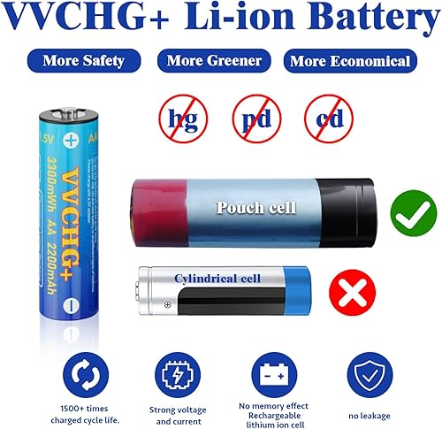 VVCHG+ USB rechargeable AA battery has 3300mWh large capacity. Embedded with innovative technology, Adopting Pouch cell (soft pack battery), NO Cylindrical cell (not steel shell cylindrical battery), safe and environmentally friendly.