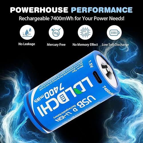 ⭐【USB Charging Design】LDLDCHI rechargeable 7400mWh d batteries lithium supports 2 d lithium batteries to be fully charged simultaneously in 5.5 hours. The charging cable can be plugged into any USB power source, such as an adapter, USB power strip, laptop, or car charger. No additional battery charger is required.