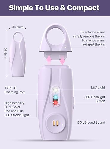 Rechargeable Personal Safety Alarm Keychain, Upgraded Dual-Color Red & Blue Strobe Light, LED Flashlight, 130dB Loud Siren, Safe Personal Alarm for Women, Kids and Elders(Rechargeable- Purple)