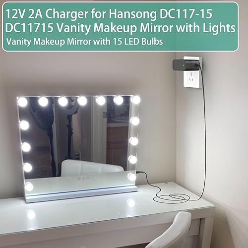 Compatible with: the replacement charger cord for Hansong makeup mirror is compatible with Hansong DC117-15 DC11715 DC-11715 DC 11715 bedroom light up vanity makeup mirror with 15 led bulbs lighted and bluetooth