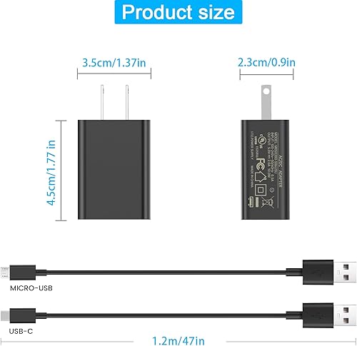 [Specifications:] Output:5V 2A Input:100-240V 50-60Hz. Cable Length:3.94ft / 1.2M. Super Quick Safely Charging: Supports maximum 5 Amp current. Made with 23 AWG high Gauge Low Impedance wires, the cable charging speed is faster than ordinary USB cable.