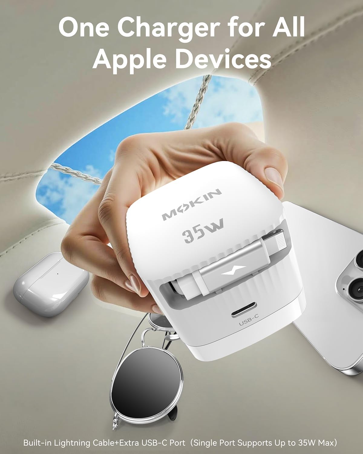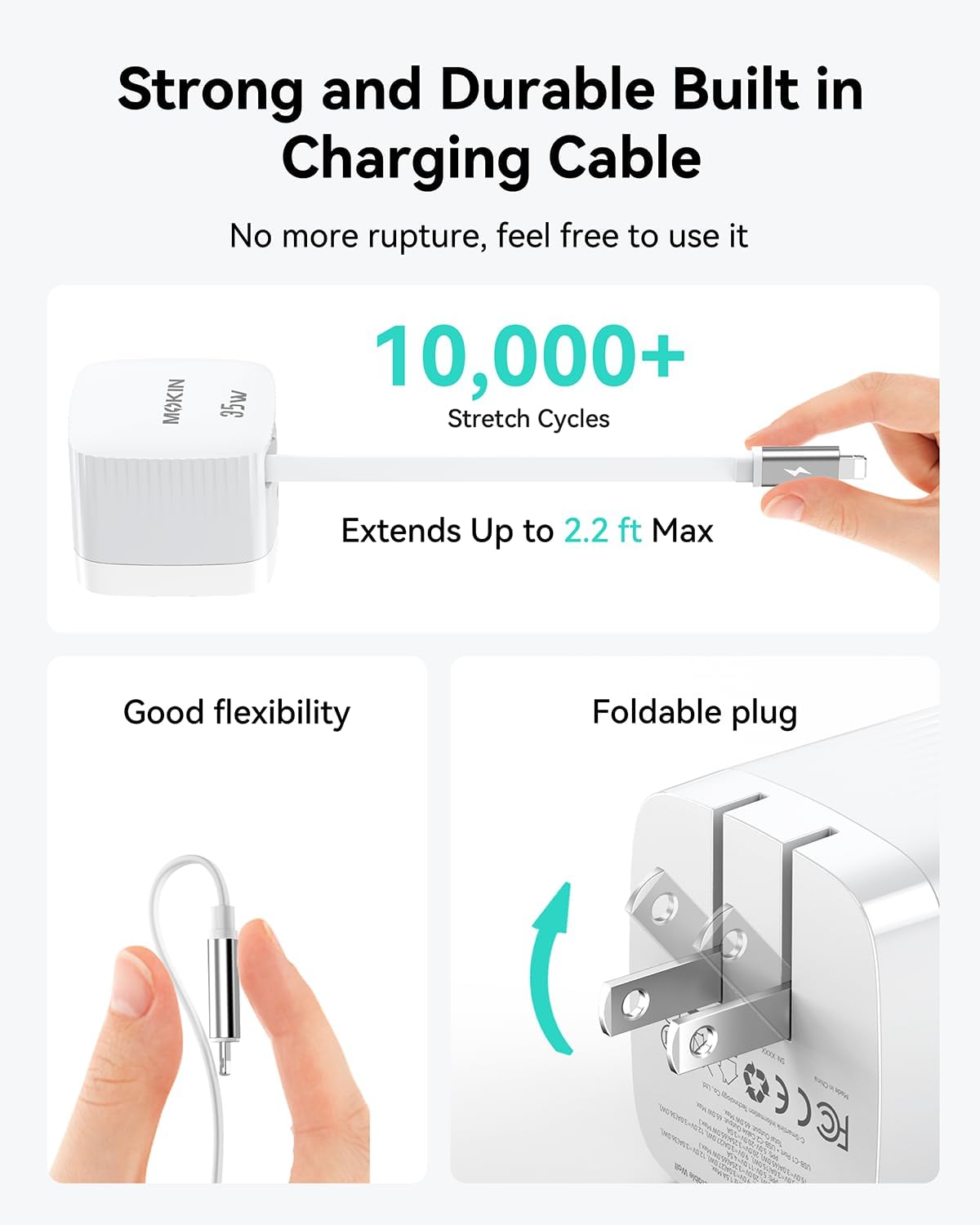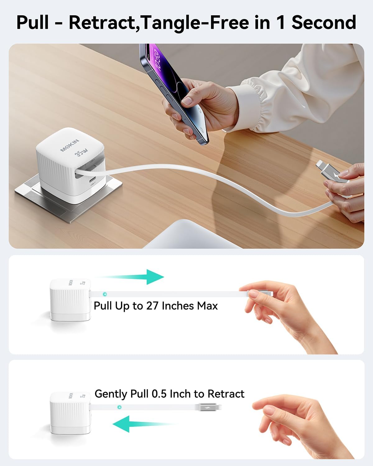 【GaN Multi-protectionTechnology】This iMokin retracatble iphone charger is outfitted with multi-protection technology, guarding against overheating, overcharging, and short circuits. Charge with complete peace of mind, knowing your devices are in safe hands
