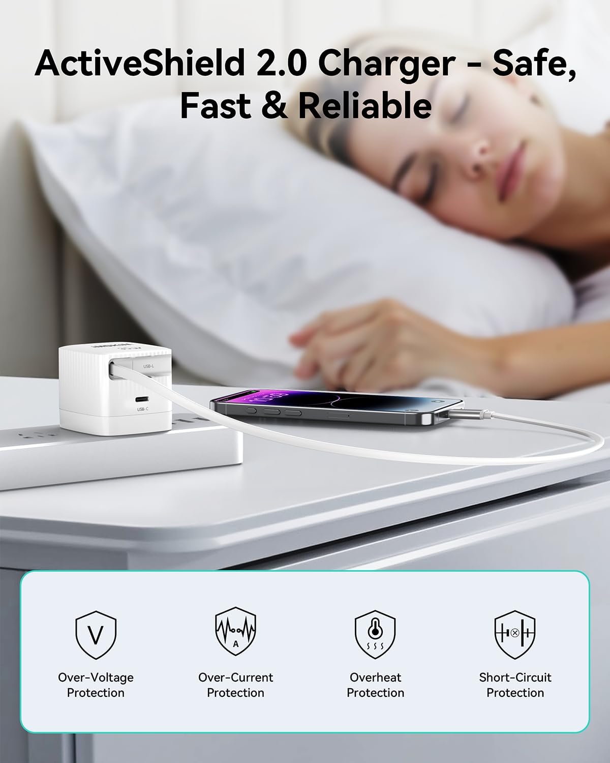 【Travel-Ready,Power on-the-go】With ABS+PC materials for heat resistance and durability. The compact foldable plug design and retractable lightning cable make it ideal for on-the-go use while protecting against cable tangles and hunt for charging cables.