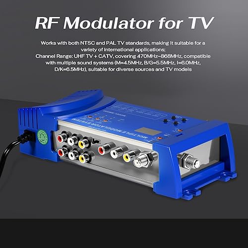 Wide Use: 3 RCA CVBS in coax rf out converter works with both NTSC and PAL TV standards, making it suitable for a variety of international applications; Channel Range: UHF TV + CATV, covering 470MHz~868MHz, compatible with multiple sound systems (M=4.5MHz, B/G=5.5MHz, I=6.0MHz, D/K=6.5MHz), suitable for diverse sources and TV models