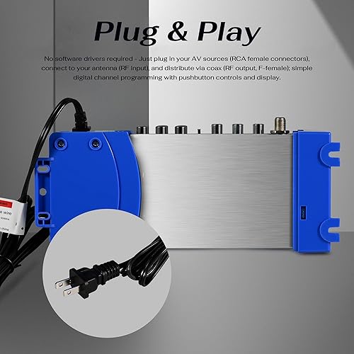 Plug & Play: No software drivers required - Just plug in your AV sources (RCA female connectors), connect to your antenna (RF input), and distribute via coax (RF output, F-female); simple digital channel programming with pushbutton controls and display