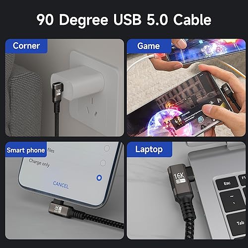 【Single Cable Solution】 This versatile USB-C USB 5 cable right angle supports data, power, and video – boasting 80Gbps super-fast data transfer, 240W super fast charging, and 16K@60Hz or 8K@120Hz video transmission. It serves as a one-cable solution for your power hub, laptop, phone or any other USB-C compatible device, eliminating the clutter and hassle of multiple cables and power adapters in your workspace.