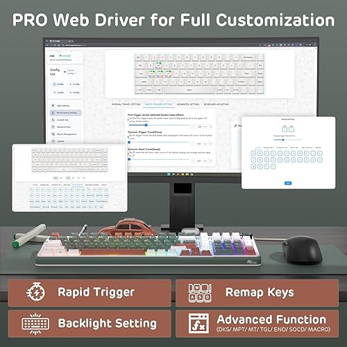 Web-Based Software for Easy Customization — Customize your RK hall effect magnetic keyboard effortlessly with our powerful web-based driver. Remap keys, create macros, adjust actuation points, personalize RGB lighting, and enable advanced functions like Rapid Trigger, DKS, MT, MPT, TGL, and SOCD. Accessible from any browser for both Windows and macOS users.