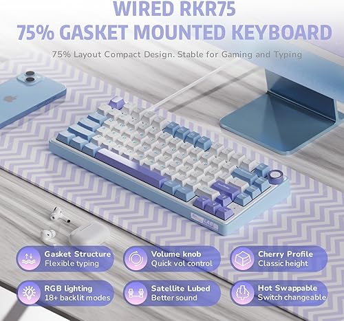 RK ROYAL KLUDGE R75 Mechanical Keyboard Wired with Volume Knob, 75% Keyboard Gasket Mounted, Hot Swappable, Creamy Sound, MDA Profile, PBT Keycaps, Pink(purple,Premium - Silver Switch Pro)
