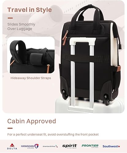 Smooth Mobility & Convertible Carry Options: This roller backpack easily switch between rolling and backpack modes with the durable aluminum handle, silent rubber wheels, and hidden shoulder straps. The carry on backpack with wheels also features a luggage strap for stacking securely on a suitcase. Perfect for campus, office, airports, or city travel, it provides hands-free comfort and smooth rolling anywhere