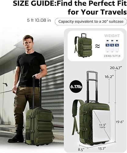 【Perfectly Combining Style and Functionality】This wheeled travel backpack features a tactical design with MOLLE webbing on the front and sides, offering expanded storage space and the ability to easily attach your favorite patches or badges to showcase your personal style. The logo area can also be customized with your own patch, making it a truly one-of-a-kind bag! The side pockets feature elastic straps to securely hold your umbrella or water bottle