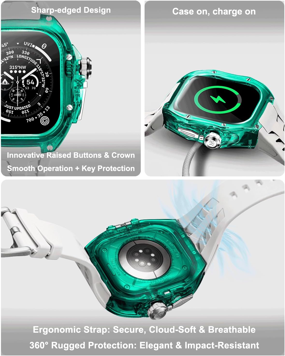Precise Fit & Enhanced Operation:Equipped with an innovative screw-down crown + oversized 3D buttons for precise, smooth control. Precision cutouts protect sensors without compromising functionality, supporting wireless charging without removal.