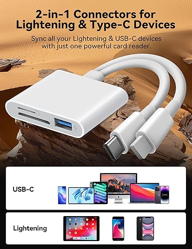 Lightening, USB-C and USB-A Built-in - Includes non-detachable Lightening, USB-C and USB-A cables, ensuring instant compatibility with modern USB-C devices (iPhone 15 / 16, iPad, laptops) and older Lightening iPhones or USB laptops and computersd evices. No extra adapters needed! Insert an SD/MicroSD card, connect to your iPhone/iPad, and instantly access, copy, or edit files (photos, videos, documents) directly from the native Files app. Perfect for photographers importing shots or travelers backing up footage on the go.