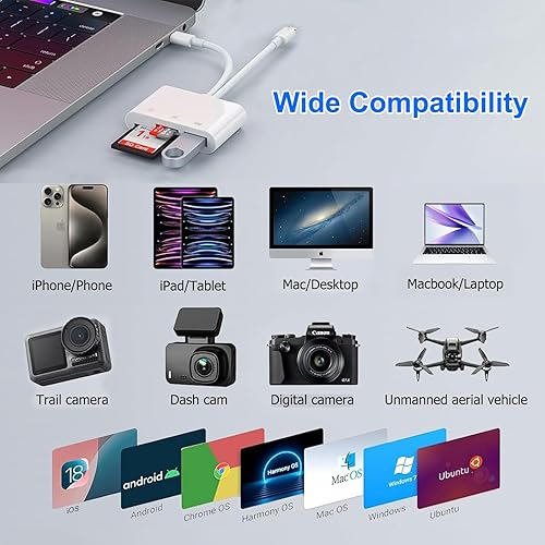 SD Card Reader for iPhone: upgraded SD card reader has dual connectors (usb c & lightning), for apple iphone 5-14, iphone 15-16, ipad, mac, andriod phone, table type c devices. Note: two connector cannot be used simultaneously