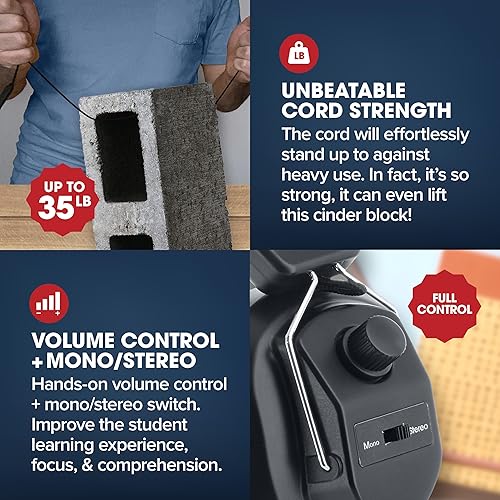 Rugged and Durable Design: Our School Headphones are built different than our competitors. These headphones are meant to last! With a rugged tough design they can take a beating. With reinforced welds and a band that is fully twistable so this construction is meant to last. The 6 foot braided fabric cord is strong enough to lift up to 35 pounds and be dropped from 20 feet and sound just like new!