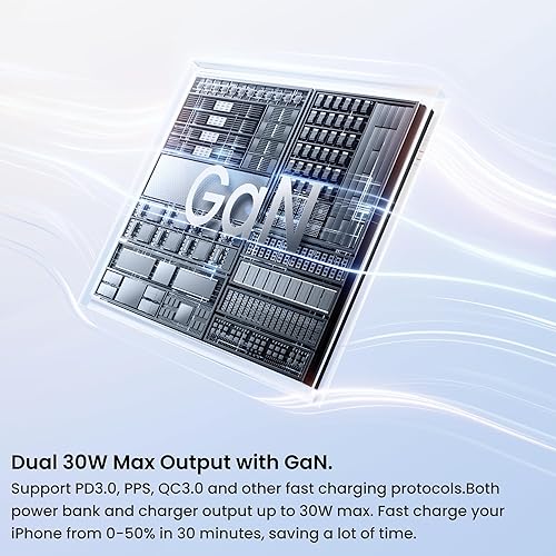 Dual 30W Max Output with GaN: Both power bank and charger output up to 30W max. Fast charge your iPhone from 0-50% in 30 minutes, saving a lot of time