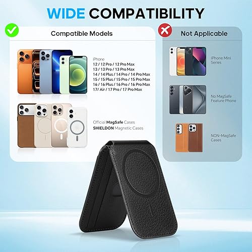 【COMPATIBILITY】 This magnetic phone stand wallet is designed for iPhone 17 Pro Max, iPhone 17 Pro, iPhone 17 Air, iPhone 17, as well as for iPhone 16/15/14/13/12 series. Our for magsafe wallet stand can also seamlessly attaches to the magnetic cases. Please note: Not compatible with iPhone mini or non-magnetic cases