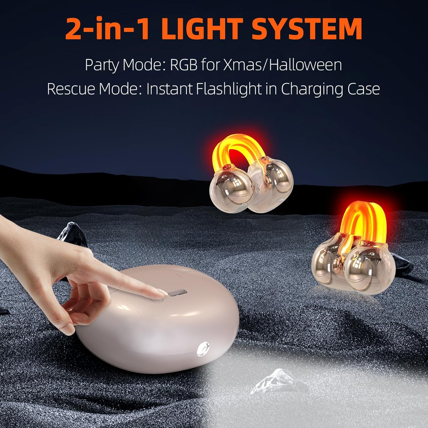 2. [Practical & Convenient] Bone conduction earbuds design with C-Shaped Bridge RGB Light - Safe for Night Running. The headphone charging case features an "instant flashlight" function. Ideal for night outings, camping item searches, or car rummaging without needing an extra flashlight. Its soft light illuminates surroundings, solving "walking in darkness" issues and enhancing headphone utility.