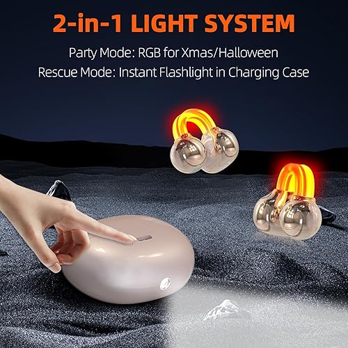 2. Practical & Convenient] Bone conduction earbuds design with C-Shaped Bridge RGB Light - Safe for Night Running. The headphone charging case features an "instant flashlight" function. Ideal for night outings, camping item searches, or car rummaging without needing an extra flashlight. Its soft light illuminates surroundings, solving "walking in darkness" issues and enhancing headphone utility.