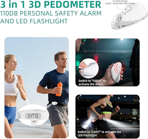 【All-in-One Practical Design】Combine a precise step tracker, bright LED flashlight, and powerful 110dB safety alarm in one compact device. Easily clips onto belts, pockets, or bags for all-day convenience without needing smartphones or Bluetooth connectivity.